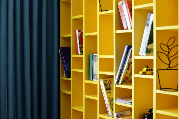 Uplift the mood with a built-in bookshelf painted with a bright color you love. A beautiful shade of orange, yellow, pink, or red can bring vibrancy and a pop of energy to a space. If you’re feeling bold, consider contrasting tones; for example, a bright bookshelf with darker trim. This option is all about personality and expressiveness, so don’t hold back.