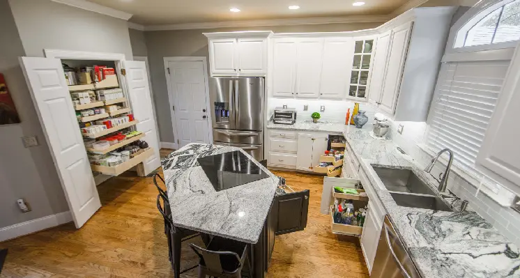 I bought a 40+ year old house and although the cabinets were solidly constructed, the shelves were all stationary. In particular, the corner cabinet in the kitchen went way back and one couldn’t easily get anything out from there. I had pullout shelves installed in the pantry, in one of the wider under counter cabinets, and in that corner cabinet. That now has pullout shelves, and when the front one is pulled out, you can slide the deeply recessed shelf into the space where the pullout shelf had been. This is a lifesaver (!), and the workmanship is flawless. I highly recommend ShelfGenie,